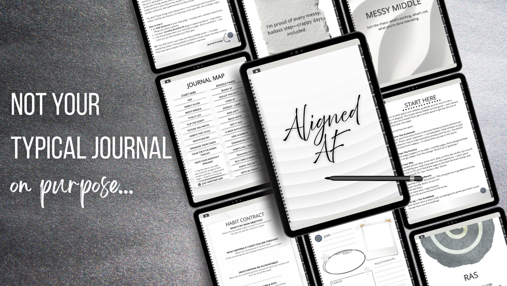 Meet the unflitered Journal – Aligned AF — your no-BS hybrid: part guided journal, part bullet journal, part gratitude journal, (diary if you say so), and all attitude. It’s designed to help you get the chaos out of your head and onto “paper” without the pressure, guilt, or glittery unicorn vibes.